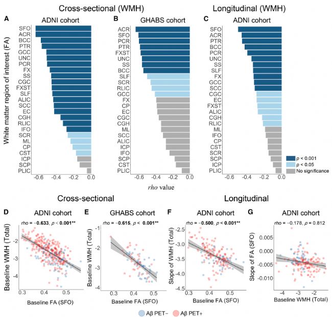 基于阿爾茨海默病神經(jīng)影像倡議(ADNI)和粵港澳大灣區(qū)健康老齡化腦研究(GHABS)兩大隊列,共納入328名ADNI參與者和78名GHABS參與者,收集了基線及縱向的Aβ PET、tau PET、擴散磁共振成像(dMRI)和T2 FLAIR數(shù)據(jù)。研究通過廣義線性模型(GLM)和線性混合效應(yīng)模型(LME)分析FA和WMH與AD病理(Aβ和tau)、年齡、血管風(fēng)險因素的關(guān)聯(lián),并依據(jù)修訂的AD生物分期標(biāo)準(zhǔn)(A/T profiles)進(jìn)行分組比較。實驗設(shè)計強調(diào)了多模態(tài)數(shù)據(jù)的整合,Simoa技術(shù)可在此框架下用于驗證血液生物標(biāo)志物與影像發(fā)現(xiàn)的相關(guān)性。