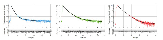 在FluoTime 300上,通過FluoMic顯微鏡對(duì)智能手機(jī)顯示屏進(jìn)行觀測,采用440 nm脈沖激光激發(fā)。測量了藍(lán)色(460 nm)、綠色(522 nm)和紅色(620 nm)像素的發(fā)射衰減特性。