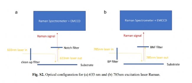 上圖展示了用于拉曼測量的光學(xué)配置簡化示意圖。研究采用的激光器為Integrated Optics公司生產(chǎn)的Matchbox型號。激光光束首先通過兩個凈化濾光片(633nm激光)或兩個帶通BP濾光片(785nm激光)。其半高全寬(FWHM)分別為5nm(633nm激光)和0.6nm(785nm激光),以實現(xiàn)單色光輸出。隨后,光線經(jīng)銀鏡導(dǎo)向物鏡進入樣品。光譜儀狹縫入口處配置兩枚帶寬25nm的陷波濾光片(工作波長633nm),用于消除瑞利信號。在785nm激光配置中,則采用光譜帶寬為0.12nm的布拉格柵陷波濾光片(BNFs)。
