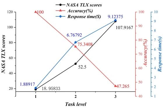 圖4. 三種任務(wù)的平均 NASA 任務(wù)負(fù)荷指數(shù)(TLX)評分與任務(wù)表現(xiàn)對比圖