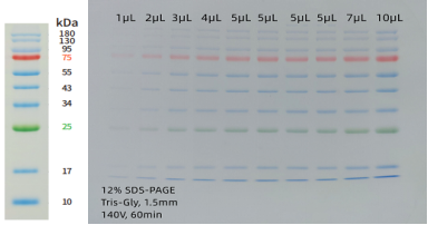分子量經(jīng)過進(jìn)口品牌非預(yù)染蛋白Marker標(biāo)定,標(biāo)示準(zhǔn)確可靠,偏移率低。