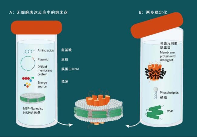 B:將去污劑和MSP添加到表達目的蛋白的細胞質(zhì)中。組成膜磷脂、蛋白質(zhì)和 MSP的復(fù)合物。
