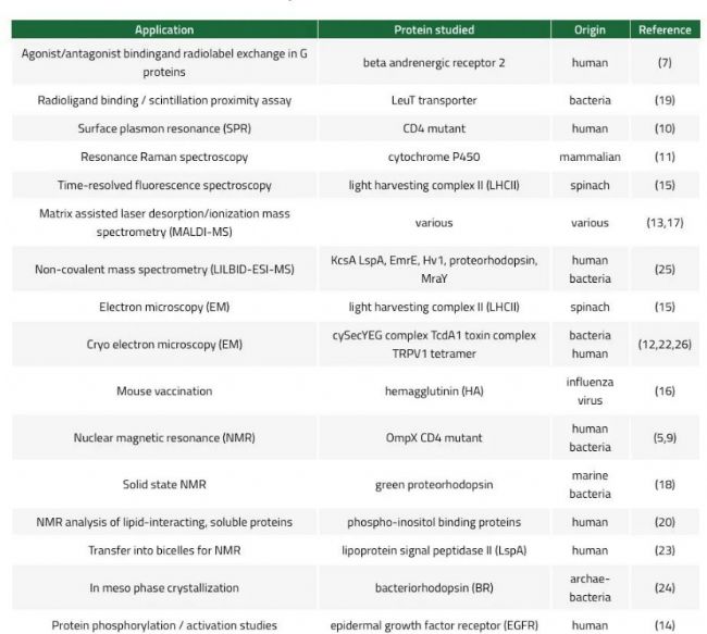 MSP納米盤最初是由Sligar及其同事一起發(fā)表的(3,4)。MSP納米盤為穩(wěn)定膜蛋白提供了完美的環(huán)境,使得通過NMR 和 SPR(9,10)等方法研究配體、激動劑或拮抗劑的結(jié)合成為可能。納米盤被證實可以提高 在冷凍電鏡中跨膜蛋白區(qū)的分辨率(22,26)。膜支架蛋白可采用組氨酸標記,以促進蛋白質(zhì)納米盤復(fù)合物的純化、檢測和固相處理。其他納米盤應(yīng)用的實例包括共振拉曼(11)、MALDI(13)、非共價質(zhì)譜法(25)、蛋白激活研究(14)、時間分辨熒光光譜(15)和蛋白質(zhì)結(jié)晶(24)。重組成納米盤的抗原已被用于提高小鼠的免疫原應(yīng)答,顯示出其作為疫苗的潛力 (16)。此外,“大腸桿菌”的整個膜蛋白質(zhì)組被重組為納米盤,從而創(chuàng)建出水溶性膜蛋白庫 (15)。在納米盤中重組的蛋白質(zhì)可以轉(zhuǎn)移到雙層膜微胞中以提高 NMR 分辨率(23)。在納米盤的協(xié)助下,甚至實現(xiàn)了對可溶性蛋白質(zhì)以及與脂質(zhì)相互作用的蛋白質(zhì)的分析 (20)。表 3 列出了納米盤應(yīng)用的實例。