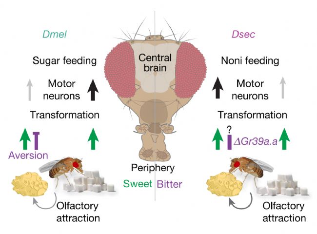 特化物種Drosophila sechellia(Dsec)專食諾麗果,而另兩種廣食性果蠅食譜多樣。通過定量攝食實(shí)驗(yàn)與鈣成像技術(shù),研究發(fā)現(xiàn):1)Dsec對諾麗果的偏好與其外周味覺神經(jīng)元苦味敏感性增強(qiáng)相關(guān),該變化源于單個(gè)味覺受體基因的小片段缺失;2)關(guān)鍵差異并非僅來自外周受體,更取決于感覺運(yùn)動(dòng)回路中對諾麗果與蔗糖信號的特異性中樞處理方式。