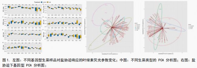 本研究依托PlantScreen-XYZ系統(tǒng)實現(xiàn)高通量植物表型參數(shù)快速采集和分析,其全植株葉綠素?zé)晒獬上窆δ芫珳?zhǔn)捕捉了鹽脅迫下不同基因型的光合動力學(xué)過程,結(jié)合配套軟件獲取的Fv/Fm、NPQ等核心參數(shù),搭配同步采集的葉面積等形態(tài)數(shù)據(jù),通過PCA分析清晰實現(xiàn)耐鹽與敏感基因型的聚類區(qū)分。實驗結(jié)果證實,耐鹽基因型能維持更高的光合效率,而敏感基因型光保護(hù)機制雖活躍但光合效率偏低,這套設(shè)備的高通量、非侵入式一體化測量,為精準(zhǔn)解析生菜耐鹽機制、篩選優(yōu)質(zhì)種質(zhì)提供了核心數(shù)據(jù)支撐。