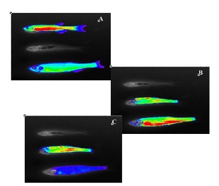 465nm激發(fā),發(fā)射波長(zhǎng):A圖550nm,B圖615nm,C圖735nm