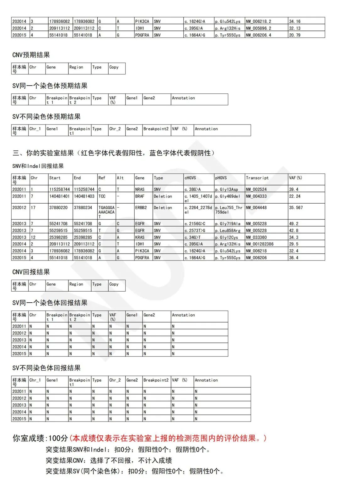 本次質(zhì)評活動共檢測5個樣本,檢測的突變類型包括點(diǎn)突變、短插入和缺失、基因重排等,從DNA樣本質(zhì)控、文庫質(zhì)控、基因突變的檢測結(jié)果、結(jié)果有效性、生信分析結(jié)果格式規(guī)范、檢測報告的信息與格式等方面對實驗室檢測的全過程進(jìn)行了評價,廣州永諾醫(yī)學(xué)檢驗所滿分通過本次測評,標(biāo)志著廣州永諾醫(yī)學(xué)檢驗所的檢測能力及質(zhì)量管理體系獲得國家權(quán)威機(jī)構(gòu)的認(rèn)可。