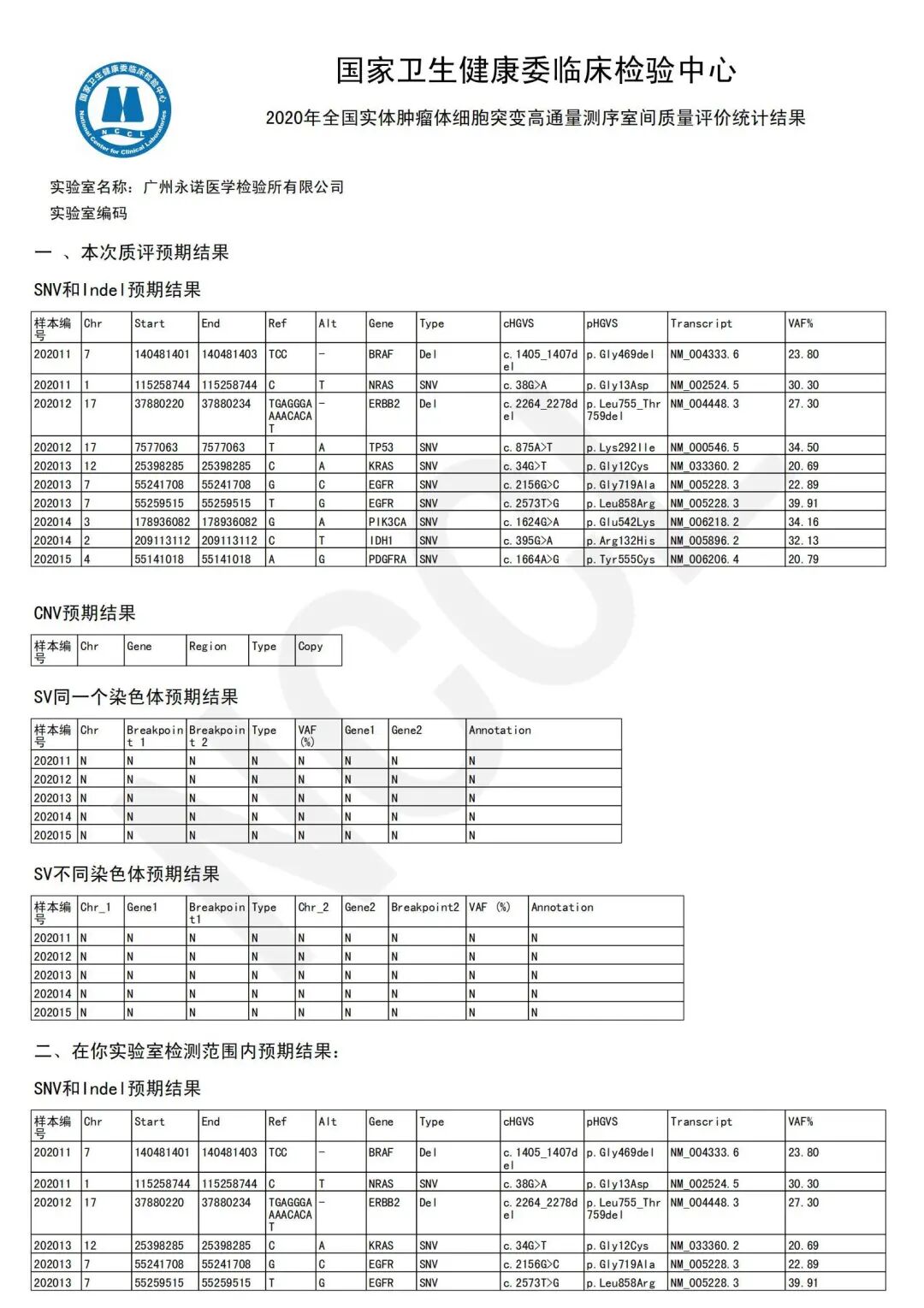 近日,國家衛(wèi)生健康委臨床檢驗中心(NCCL,National Center for Clinical Laboratories)下發(fā)了《2020年全國實體腫瘤體細(xì)胞突變高通量測序檢測室間質(zhì)量評價》成績單,廣州永諾醫(yī)學(xué)檢驗所滿分通過該項質(zhì)評活動!