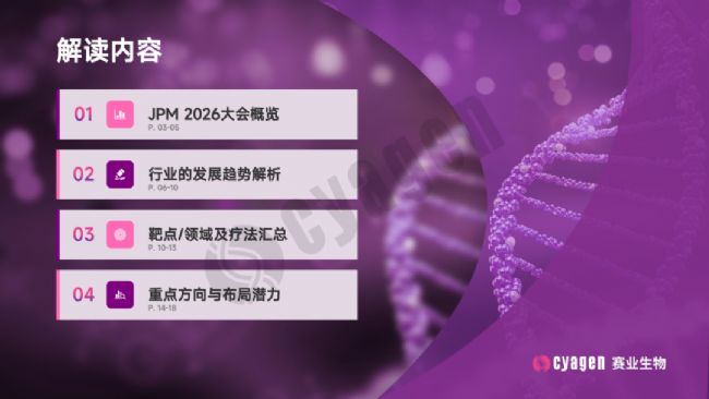 賽業(yè)生物特此準(zhǔn)備了一份JPM 2026解讀報(bào)告,請(qǐng)下載JPM Healthcare Conference 2026 深度解讀,從數(shù)百家參會(huì)機(jī)構(gòu)中,嚴(yán)選了109家具有行業(yè)顛覆性的核心藥企進(jìn)行系統(tǒng)性分析,旨在通過這些核心樣本穿透資本迷霧,為醫(yī)藥行業(yè)定調(diào)全年的投資邏輯與研發(fā)新坐標(biāo)。相關(guān)解讀內(nèi)容節(jié)選如下。