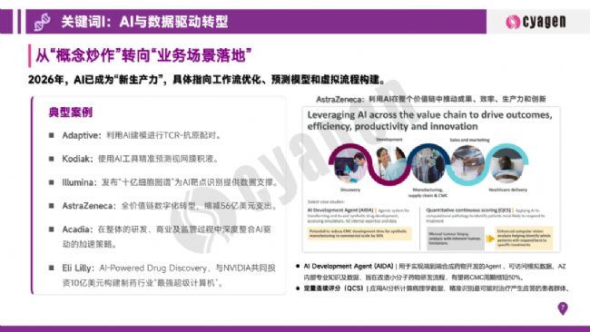 AI已正式進(jìn)入業(yè)務(wù)場(chǎng)景。阿斯利康利用AI Agent (AIDA) 系統(tǒng)有望將CMC周期縮短50%。禮來則與NVIDIA共同投資10億美元構(gòu)建制藥行業(yè)最強(qiáng)超級(jí)計(jì)算機(jī)。Illumina的“十億細(xì)胞圖譜”為AI靶點(diǎn)識(shí)別提供了底層數(shù)據(jù)支撐。