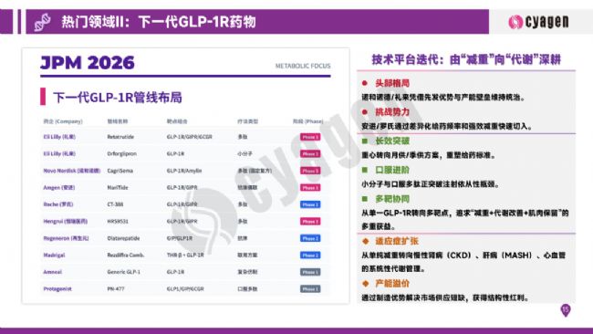 下一代GLP-1R的競(jìng)爭(zhēng)已超越體重?cái)?shù)值。禮來的Retatrutide作為三靶點(diǎn)激動(dòng)劑,追求減重與肌肉保留的平衡。諾和諾德及中國恒瑞則在月供/季供方案上激烈角逐,代謝管理已從單純減重?cái)U(kuò)展至心腎綜合風(fēng)險(xiǎn)的全方位干預(yù)。