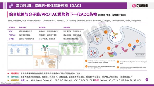 潛力新星DAC正在崛起。它完美融合了ADC的精準(zhǔn)導(dǎo)向與降解劑的催化高效。全球50+項(xiàng)管線中,恒瑞、科倫博泰等中國企業(yè)表現(xiàn)搶眼。其優(yōu)勢(shì)在于能靶向難成藥的胞內(nèi)蛋白,并顯著克服傳統(tǒng)ADC的耐藥性。