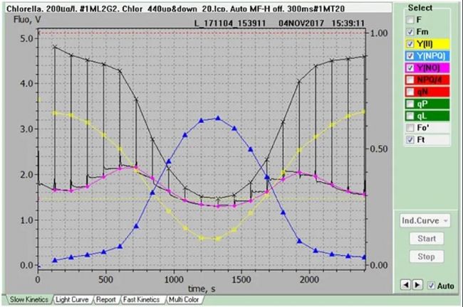 上圖是測量PS II互補量子產(chǎn)率Y(II)+Y(NPQ)+Y(NO)=1的光曲線示例。由于記憶效應(yīng),光強減弱時誘導的動力學可能與光強增強時不同。這種現(xiàn)象被稱為滯后。這里觀察到的光誘導Y(II)降低和Y(NPQ)升高的完全可逆性是生理健康樣品的特征。