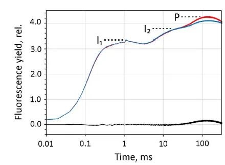 PAM快相應(yīng)用的一個例子是同時測量兩個不同波長的O-I1-I2-P瞬變:在波長<710 nm處測得的熒光主要是PSⅡ熒光,而>700 n處的熒光則是PSⅡ和PSI熒光的混合熒光。該結(jié)果是由Klughammer等人(2024年)對小球藻細胞稀釋懸浮液(440nm ML和MT)的測量首次發(fā)現(xiàn)的。