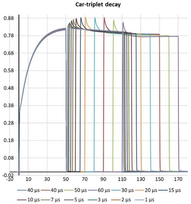下圖顯示了一組測量值,根據(jù)這些測量值可以確定類胡蘿卜素三重態(tài)衰變動力學。該數(shù)據(jù)集說明了閃光時間的精度,以及閃光燈提供兩次相隔1μs的相同強度閃光的能力。