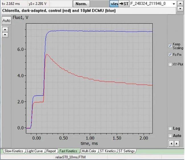 • PAM記錄中嵌入的STK:由于在快速非調(diào)制和PAM測量之間快速切換[8-10μs切換時間],ST可以放置在傳統(tǒng)測量中的任何位置,例如O-I1-I2-P或慢速動力學記錄,所得STK揭示了閃光時刻PS Ⅱ狀態(tài)的詳細信息。所有這些結(jié)合在一起,使MULTI-COLOR-PAM-Ⅱ成為一款非常全面的熒光計,允許用戶以多種不同的方式探測和監(jiān)測PS Ⅱ和光合電子傳遞鏈。