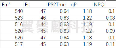 (5)測量Fm’,Fs,可計算實(shí)際光化學(xué)效率(ΦPSII)等參數(shù)。