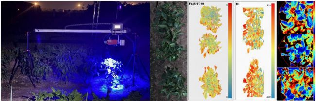 ®輕便型近地遙感系統(tǒng)夜間工作圖、辣椒植株RGB成像圖、葉綠素熒光參數(shù)F685/F740、健康指數(shù)HI、紅外熱成像