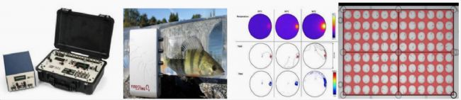 從左至右依次是:FMS便攜式多功能能量代謝測量儀;魚類呼吸代謝測量系統(tǒng)中圖:VISIR動物行為觀測分析結果圖;斑馬魚高通量行為觀測系統(tǒng)