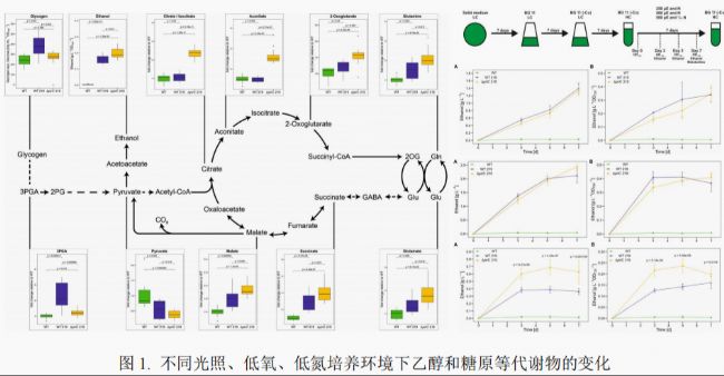 德國Böhm J團(tuán)隊(Frontiers in microbiology, 2023)通過構(gòu)建攜帶pirC基因突變的產(chǎn)乙醇藍(lán)藻菌株,利用MC1000多通道藻類培養(yǎng)監(jiān)測系統(tǒng)模擬不同光照條件及低氧低氮環(huán)境,探究了不同氮、碳水平下pirC突變對乙醇產(chǎn)量的影響,并分析了該突變對藍(lán)藻碳分配(如糖原儲存、糖酵解途徑)及整體初級代謝的調(diào)控作用。實驗結(jié)果顯示:在氮限制條件下,2-酮戊二酸的積累促使pirC從與PII蛋白的結(jié)合態(tài)中釋放,進(jìn)而抑制磷酸甘油酸變位酶;而pirC的缺失可解除這一抑制效應(yīng),增加丙酮酸供應(yīng),最終提升乙醇產(chǎn)量;在正常氮條件下,糖原儲存是碳分配的主要方向,從而削弱了pirC突變的作用。該研究證實,pirC介導(dǎo)的碳通量調(diào)控是藍(lán)藻乙醇生產(chǎn)的關(guān)鍵靶點,為構(gòu)建高效產(chǎn)乙醇藍(lán)藻“綠色細(xì)胞工廠”提供了理論依據(jù)與技術(shù)參考。