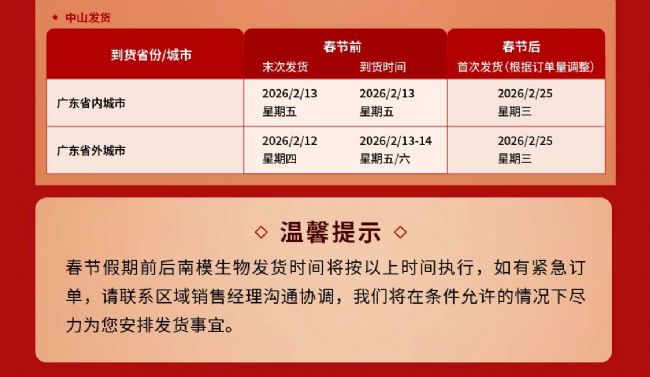 南模生物2026年春節(jié)期間發(fā)貨安排