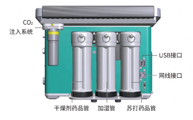 主機(jī)背面安裝有1個(gè)CO2注入系統(tǒng)和3個(gè)化學(xué)藥品管。除此之外,還包括USB接口(支持外部存儲(chǔ)設(shè)備)和網(wǎng)線接口等。