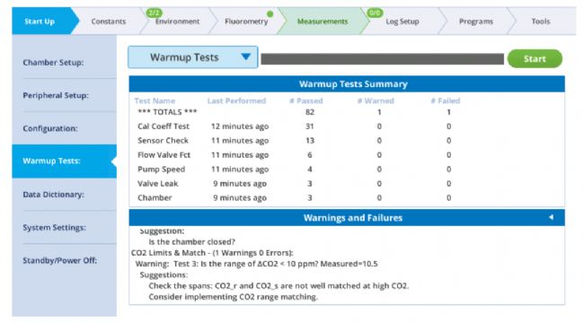 在葉室關(guān)閉的情況下,點(diǎn)按“Start Up > Warmup Tests”進(jìn)行系統(tǒng)自檢。首次啟動(dòng)儀器時(shí)、更換葉室或化學(xué)藥品后,推薦進(jìn)行此測(cè)試。系統(tǒng)自檢耗時(shí)不超過(guò)15分鐘,自檢結(jié)束后會(huì)報(bào)告測(cè)試結(jié)果。報(bào)告中會(huì)針對(duì)未通過(guò)測(cè)試的項(xiàng)目給出解決建議,請(qǐng)?jiān)谶M(jìn)行正式測(cè)量前解決所有問(wèn)題。