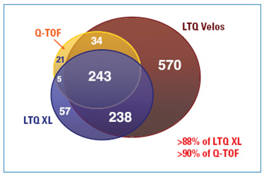 • 在一個(gè)復(fù)雜混合樣品中, LTQ Velos 離子阱比四級(jí)桿 - 飛行時(shí)間質(zhì)譜能多鑒定 240% 個(gè)蛋白質(zhì)和 130% 個(gè)特異性肽段,而且,通過(guò)四級(jí)桿 - 飛行時(shí)間質(zhì)譜鑒定到的蛋白,有 90% 以上都能在 LTQ Velos 看到。