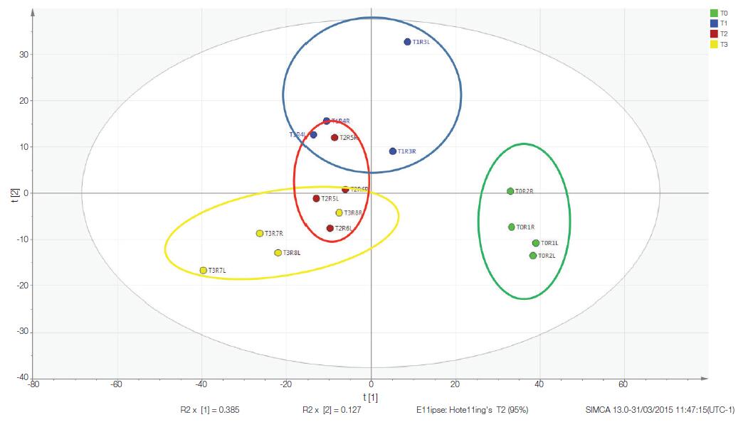 圖 6. 分解數(shù)據(jù)的 PLS-DA 模型。該模型為有監(jiān)督多變量分析,將高維數(shù)據(jù)(例如,大量強度不同的代謝物)折疊為涵蓋數(shù)據(jù)集中主要變化的幾種主成分。在本例中,X 軸是主成分 1,Y 軸是主成分 2。注意,本項研究對樣品進(jìn)行了適當(dāng)聚類,每個群組聚集在一起,T0 已明顯與其他群組分開。