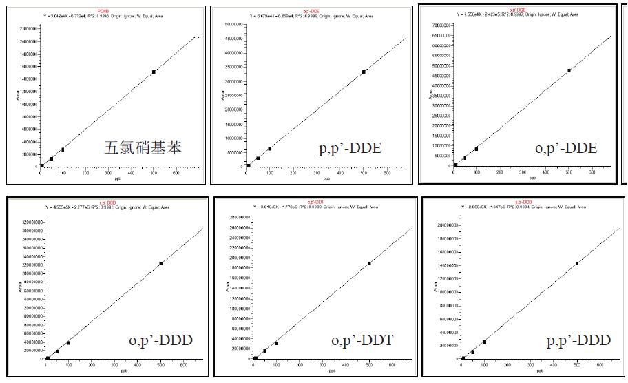本實驗用TSQ Quantum XLS結合高惰性的弱極性色譜柱分析有機氯農藥和擬除蟲菊酯類農藥,得到了非常出色的結果;|樣品的最低檢測限在0.05-0.5ppb之間,在1ppb-500ppb的范圍有良好的線性,且在基質加標樣品連續(xù)5針進樣的RSD%在1.52%-3.30%。