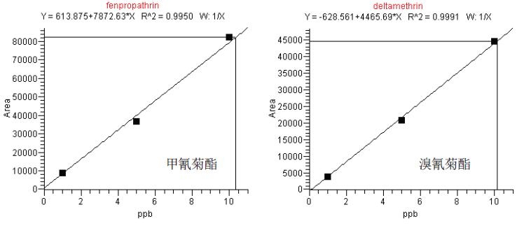 分別配置韭菜和菠菜基質(zhì)中這4種農(nóng)藥的梯度混合溶液,濃度分別為1ppb,5ppb和10ppb,建立標(biāo)準(zhǔn)曲線。這兩種基質(zhì)中每種農(nóng)藥的R2均大于0.995,表明線性良好。韭菜基質(zhì)中各化合物的標(biāo)準(zhǔn)曲線如圖3所示:
