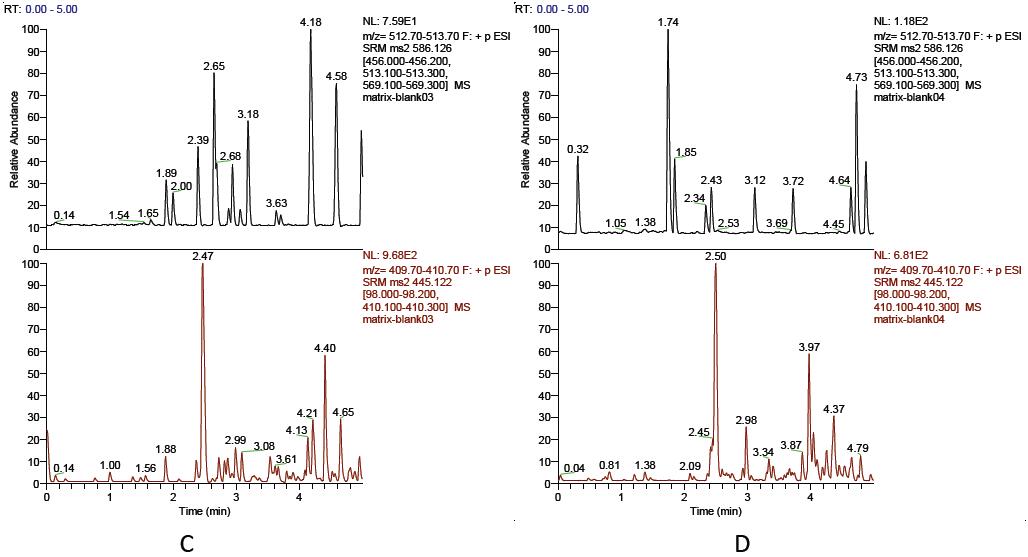 TSQ Vantage 三重四極桿串聯(lián)質(zhì)譜儀(賽默飛世爾科技Thermo Fisher Scientific 公司),配置有電噴霧電離源(ESI);Dionex Ultimate 3000 RSLC 超高壓液相色譜。