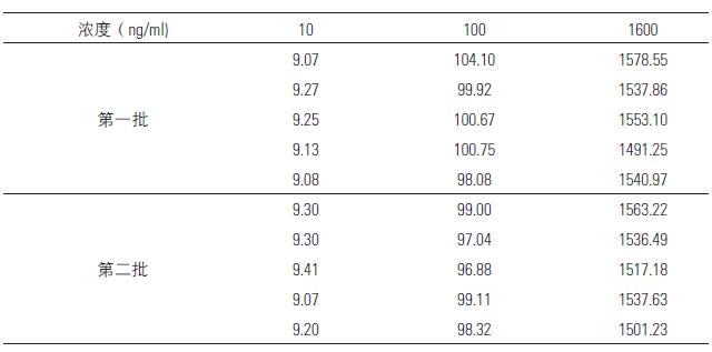 分別取不同量的替加環(huán)素加入到空白血漿中,配成0.2mL的濃度分別為10,100,1600ppb 的標(biāo)準(zhǔn)含藥血漿,按“血漿樣品處理”項(xiàng)下操作,在日內(nèi)和日間對(duì)每種濃度各做5 份樣品,記錄色譜圖,計(jì)算濃度,并與加入的標(biāo)準(zhǔn)濃度比較,結(jié)果見表6。