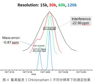 在有基質(zhì)干擾時(shí),分辨率的高低會(huì)影響到精確質(zhì)量的測(cè)定。超高分辨率會(huì)提高儀器精確質(zhì)量數(shù)測(cè)定的準(zhǔn)確性,可以對(duì)精確質(zhì)量極為接近的化合物進(jìn)行有效鑒別。實(shí)驗(yàn)中,分別在四種不同分辨率(15,000;30,000;60,000;120,000)下對(duì)化合物 10 µg/L 氯苯胺靈(Chlorpropham)碎片離子(m/127.01833)在大蔥樣品的測(cè)定結(jié)果,當(dāng)分辨率低于 60,000時(shí),離子與同重元素的干擾離子無法分開。因而在判斷上會(huì)發(fā)生假陰性或假陽性結(jié)果。只有當(dāng)分辨率在60,000 及以上時(shí),兩個(gè)同重元素離子可以明顯區(qū)分,并可以對(duì)氯苯胺靈快速判斷和準(zhǔn)確定量,如圖4所示。