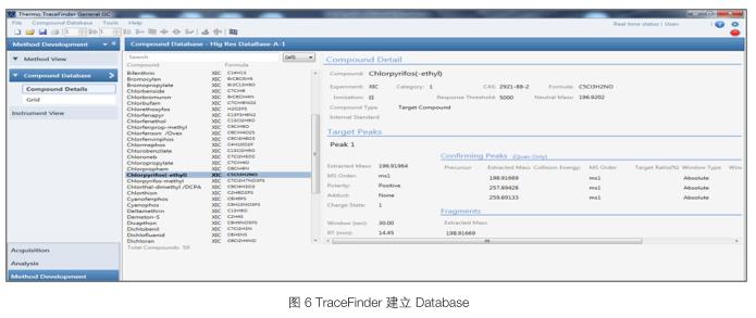 本實(shí)驗(yàn)選取了435種農(nóng)藥化合物,配制成2.0 mg/L的混合標(biāo)準(zhǔn)溶液,由儀器測(cè)定,在全掃描模式(FullScan)下獲得相應(yīng)化合物的保留時(shí)間,碎片離子的精確分子量、化學(xué)式等信息。每種化合物選取 2-5 個(gè)碎片離子,獲得離子信息(精確質(zhì)量、化學(xué)式)。數(shù)據(jù)導(dǎo)入TraceFinder中,建立相關(guān)數(shù)據(jù)庫(Database)。如圖 6 所示。TraceFinder不僅可以實(shí)現(xiàn)數(shù)據(jù)快速、批量、自動(dòng)化處理,而且集成定性、定量及方法建立等功能,根據(jù)建立的Database可實(shí)現(xiàn)目標(biāo)物篩查(Targeted Screening),對(duì)檢測(cè)樣品中的農(nóng)藥殘留進(jìn)行快速篩查。Database 中主要包含化合物名稱、CAS 登記號(hào)、碎片離子信息(精確質(zhì)量、化學(xué)式),保留時(shí)間等信息。