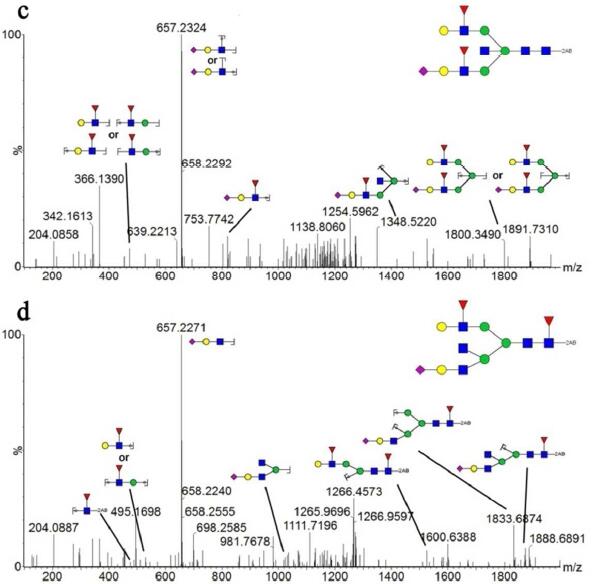 Figure 3 MS2 spectra of 2-AB-labeled N-glycan structures. Diagnostic ions are marked with corresponding fragment structures. (a) NeuGc1NeuAc1HexNAc4Hex5 from rhFSH [(M+2H)2+ at m/z 1180.34]. (b) NeuAc2HexNAc4Hex5SO41 from rhFSH, [(M+Na+H)2+ at m/z 1214.36]. *The NeuAc was dehydrated. (c) and (d) The two isomers of Fuc2NeuAc1HexNAc5Hex5 from uhFSH, [(M+2H)2+ at m/z 1274.48].