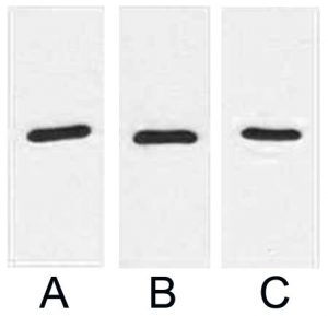 抗體驗證結果圖(A,1:2000稀釋; B,1:3000稀釋; C,1:5000稀釋)