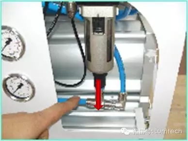 1.拆下過濾器外部連接管。向上按住街頭藍(lán)色部分,拔出連接管。