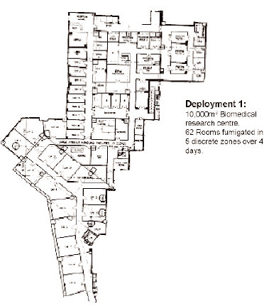 如此大型的項目需要大量的前期準備工作,在實施的每個階段Bioquell的RBDS項目經(jīng)理同客戶保持著緊密的聯(lián)絡(luò)。根據(jù)目標區(qū)的布局結(jié)構(gòu)、客戶需求和其他后勤方面的考慮將其分為幾個獨立的區(qū)域分別熏蒸,每個獨立區(qū)域配合精確計算的循環(huán)參數(shù)進行獨立的消毒操作。