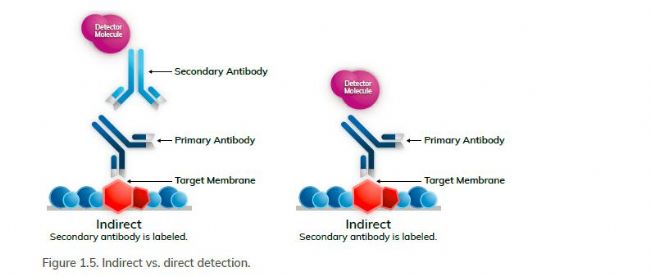 在直接檢測方法中,酶直接連接到一抗上(圖1.5)。操作簡單,檢測步驟少。雖然直接檢測是快速和直接的,但它往往比間接檢測的靈敏度低,因為在這個過程中可以發(fā)生信號放大的步驟更少。此外,酶直接標(biāo)記到一抗上可能會造成成本和資源上的限制。