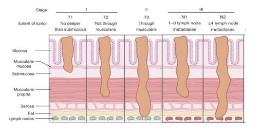 結直腸癌(colorectal cancer, CRC) 是胃腸道中常見的惡性腫瘤,早期癥狀不明顯,隨著癌腫的增大而表現排便習慣改變、便血、腹瀉、腹瀉與便秘交替、局部腹痛等癥狀,晚期則表現貧血、體重減輕等全身癥狀。其發(fā)病率和病死率在消化系統(tǒng)惡性腫瘤中僅次于胃癌、食管癌和原發(fā)性肝癌。 結直腸癌可以發(fā)生在結腸或直腸的任何部位,但以直腸、乙狀結腸為多見,其余依次見于盲腸、 升結腸、 降結腸及橫結腸。癌瘤大多數為腺癌,少數為鱗狀上皮癌及粘液癌。本病可以通過淋巴、血液循環(huán)及直接蔓延等途徑,播散到其他組織和臟器。根據臨床表現、 X 射線鋇劑灌腸或纖維結腸鏡檢查,可以確診。治療的關鍵在于早期發(fā)現、及時診斷和手術根治。預后取決于早期診斷和及時手術治療。一般癌腫只限于腸壁者預后較好,浸潤到腸外者預后較差,年輕患者、癌瘤浸潤廣泛、有轉移者或有并發(fā)癥者預后不良【1】。結直腸癌的分級如圖 1、圖 2 所示。 治療指導方案見表 1【2】,具體診療建議請參考《CSCO 結直腸癌診療指南(2019 年版)》【3】。