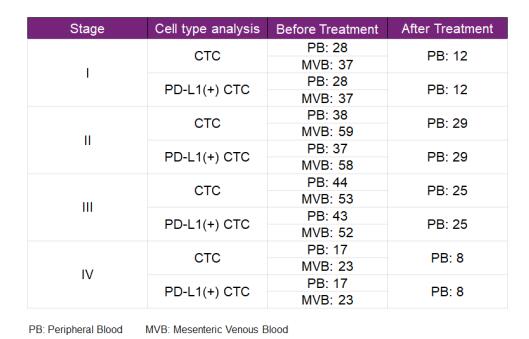 對于手術前取樣的腸系膜靜脈血(MVB)樣本, CTCs 和 PD-L1(+) CTCs 的數目和腫瘤階段密切相關, PD-L1(+) CTCs 的數目可以預示腫瘤未來是否會入侵血管和淋巴管,是否是潛在高風險族群? 對 Stage Ⅱ的患者, MVBCTCs 的檢測可以幫助確認在手術后是否要進行化療? 手術后取樣的外周血(PB)樣本,可用來預測早期復發(fā)或轉移的患者,有利于對患者進行長期跟進。 對于本次臨床研究, MiCareo公司會繼續(xù)跟進患者, 收集更多的樣本進行后續(xù)研究【6】。