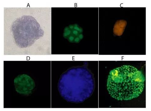 在BME中培養(yǎng)16天后,對MCF-10A細(xì)胞進(jìn)行染色:A)細(xì)胞染色試劑盒(結(jié)構(gòu));B)細(xì)胞核;C)線粒體膜電位; BME中培養(yǎng)12天后,對PC-3細(xì)胞進(jìn)行染色:D)Calcein AM(細(xì)胞活力);E)CPA染料1(細(xì)胞核);F)線粒體膜電位