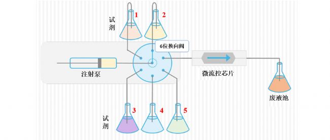系統(tǒng)示意圖如下圖。圖中,注射泵與1個6位換向閥中心閥口相連;6位換向閥的1個出口與微流控芯片相連,其余5個出口與5個試劑瓶相連;與微流控芯片相連的廢液池用于收集廢液。