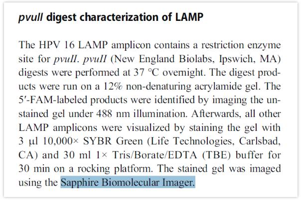 2020年6月3日,由Lena Landaverde等在《Analytical and Bioanalytical Chemistry》期刊中發(fā)表了《Method for the elucidation of LAMP products captured on lateral flow strips in a point of care test for HPV 16》的文章,文中介紹了一種使用熒光染色的方法對(duì)LAMP產(chǎn)物進(jìn)行表征,Azure Sapphire對(duì)5'-FAM標(biāo)記的產(chǎn)物在488 nm光源下掃描成像來(lái)進(jìn)行驗(yàn)證。