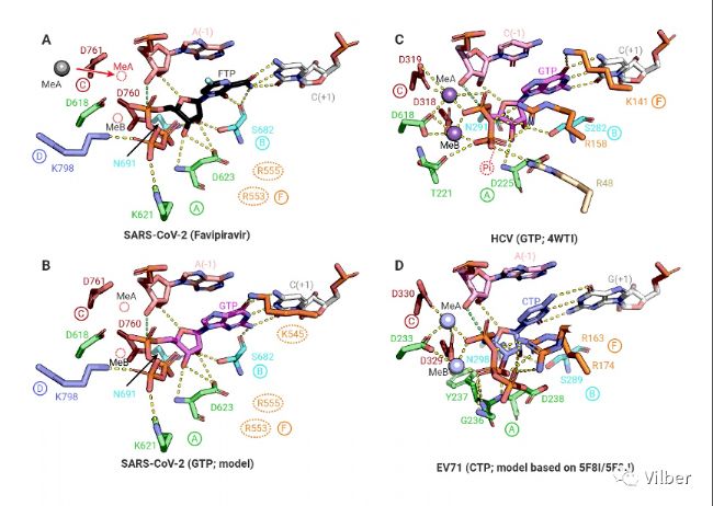 此外,研究人員通過冷凍電鏡技術(shù)解析了法匹拉韋與新冠聚合酶復(fù)合物的高分辨率結(jié)構(gòu)。通過結(jié)構(gòu)發(fā)現(xiàn),法匹拉韋還處于三磷酸形式,沒有與前一位核苷酸殘基形成磷酸二酯鍵,說明聚合酶此時(shí)處于之前從未報(bào)道過的催化前構(gòu)象。同時(shí),研究人員也發(fā)現(xiàn),聚合酶識別法匹拉韋的氨基酸殘基在不同病毒中都相對保守。這一結(jié)構(gòu)不僅幫助研究人員進(jìn)一步了解新冠病毒聚合酶的復(fù)制周期,同時(shí)也為開發(fā)廣譜性抗病毒藥物提供了結(jié)構(gòu)基礎(chǔ)。
