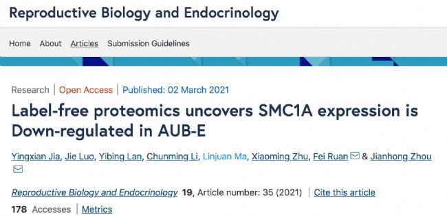 2021年3月發(fā)表在《Reproductive Biology and Endocrinology》(生殖生物學(xué)和內(nèi)分泌學(xué))的這篇文章,來自浙江大學(xué)醫(yī)學(xué)院附屬婦產(chǎn)科醫(yī)學(xué)院(暨浙江省婦女保健院)周堅(jiān)紅研究團(tuán)隊(duì)。對(duì)于AUB-E型疾病,該團(tuán)隊(duì)結(jié)合多年的臨床診斷和研究,利用無標(biāo)記的蛋白質(zhì)組學(xué)揭示SMC1A(染色體修復(fù)蛋白1A亞型)在AUB-E型體內(nèi)表達(dá)下調(diào)。這一結(jié)論同時(shí)得到Western Blot和免疫組化兩種方法的一致性驗(yàn)證。