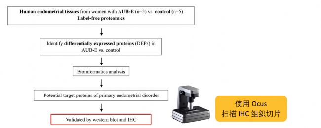 文章中包含了詳細(xì)的的實(shí)驗(yàn)流程如圖 1,對(duì)AUB-E病患(實(shí)驗(yàn)組)和健康女性(對(duì)照組)的子宮內(nèi)膜增生組織采樣,HPLC高效液相色譜解析并分離出樣品內(nèi)的蛋白。這些蛋白通過Liner Ion Trap(LTQ)-Orbitrap 離子阱和高場(chǎng)Orbitrap組合式質(zhì)譜的檢測(cè)(如定性/定量),并完成相應(yīng)數(shù)據(jù)的比對(duì)和處理;谝陨蠑(shù)據(jù),Cytoscape軟件(對(duì)蛋白質(zhì)相互作用路徑的預(yù)測(cè)分析)的富集分析法得DEPs(差異表達(dá)蛋白)結(jié)果,同SMC1A蛋白相關(guān)(具體圖示見原文)。隨后,大量的生信分析得出結(jié)論:SMC1A(染色體修復(fù)蛋白1A亞型)在AUB-E型體內(nèi)表達(dá)下調(diào),并得到Western blot和免疫組化兩種方法的雙重驗(yàn)證。其中,Ocus(芬蘭Grundium)用于對(duì)免疫組化(IHC方法)的組織切片,進(jìn)行數(shù)字化掃描和圖像保存、導(dǎo)出,如圖2。圖像分析得到AUB-E型病患的SMC1A 表達(dá)下調(diào),且對(duì)比Stromal間質(zhì)細(xì)胞,Glandular epithelium(腺上皮細(xì)胞) 的下調(diào)更明顯(促進(jìn)了大量腺上皮細(xì)胞增殖)。