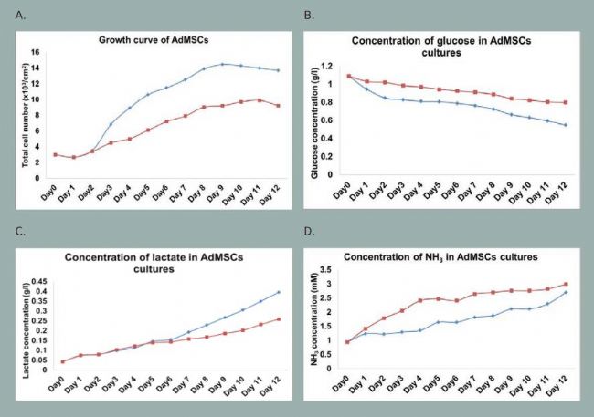 細(xì)胞培養(yǎng)周期為 12 天,每日進(jìn)行采樣分析細(xì)胞生長(zhǎng)狀態(tài)、生物化學(xué)和代謝產(chǎn)物指標(biāo)進(jìn)行對(duì)比。細(xì)胞密度比較結(jié)果表明,脂肪間充質(zhì)干細(xì)胞培養(yǎng)在對(duì)數(shù)生長(zhǎng)期(4 天)和平臺(tái)期(9 天)中, 在錐形瓶條件下擴(kuò)增比在旋轉(zhuǎn)培養(yǎng)瓶條件下細(xì)胞數(shù)量高 1.6-1.8倍。日常代謝產(chǎn)物分析顯示,培養(yǎng)早期旋轉(zhuǎn)培養(yǎng)瓶中氨水平較高,但錐形瓶中沒有此現(xiàn)象,這可能是由于攪拌子產(chǎn)生的剪切力造成的干細(xì)胞損傷所引起的。