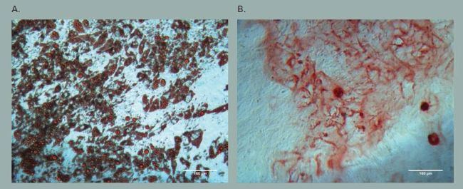 從錐形瓶和轉(zhuǎn)瓶中收獲脂肪間充質(zhì)干細(xì)胞,并置于 50 mL 試管中。當(dāng)微載體沉淀于試管底部之后, 移除上清液, 使用DPBS 清洗細(xì)胞。隨后,在 37 °C 下使用 5 mL 預(yù)熱過的胰蛋白酶 - EDTA 溶液處理 10 分鐘。在培養(yǎng)期間,隨機(jī)渦旋試管2 秒鐘,并加入等體積的胰蛋白酶中和溶液。微載體沉淀于試管底部,隨即收集上清液。使用 DPBS 清洗微載體 2-3 次,并收集盡量多的上清液于 50 mL 試管中。潤(rùn)洗之后 120 g 離心5 分鐘,脂肪間充質(zhì)干細(xì)胞被收集于試管底部,并在 5 mL 間充質(zhì)干細(xì)胞培養(yǎng)基中重懸。以 18000 個(gè)細(xì)胞 /cm2 的密度接種于 24 孔板中。使用 ATCC 分化分析試劑盒分析脂肪細(xì)胞和骨細(xì)胞的分化情況。分化的脂肪細(xì)胞和骨細(xì)胞可以依據(jù) Oil red O 或者Alizarin red S 試劑盒(ScienCell®)廠商的指示將特定細(xì)胞染色來鑒別。使用 OLYMPUS CK40 顯微鏡觀察。